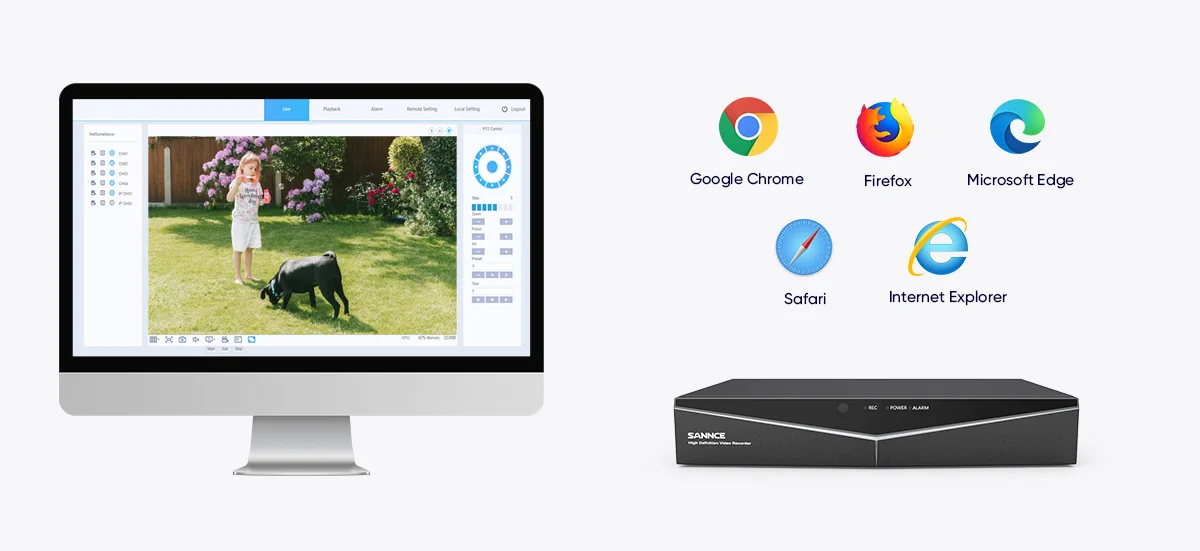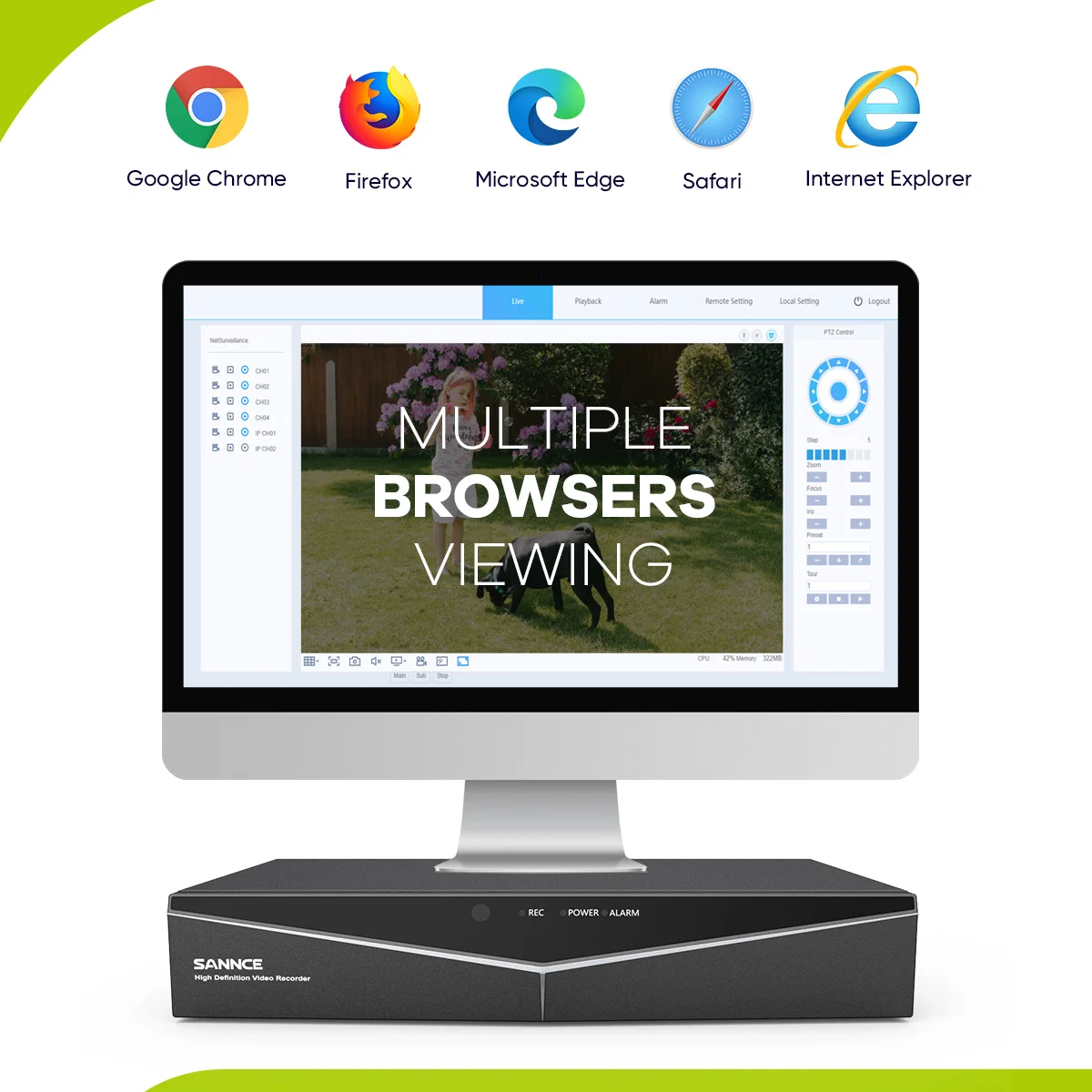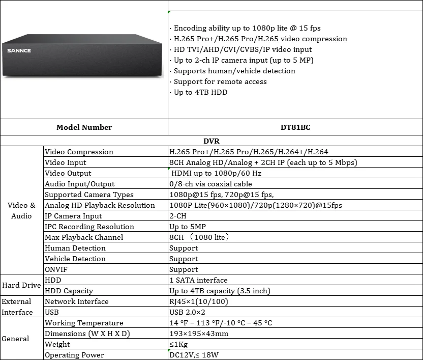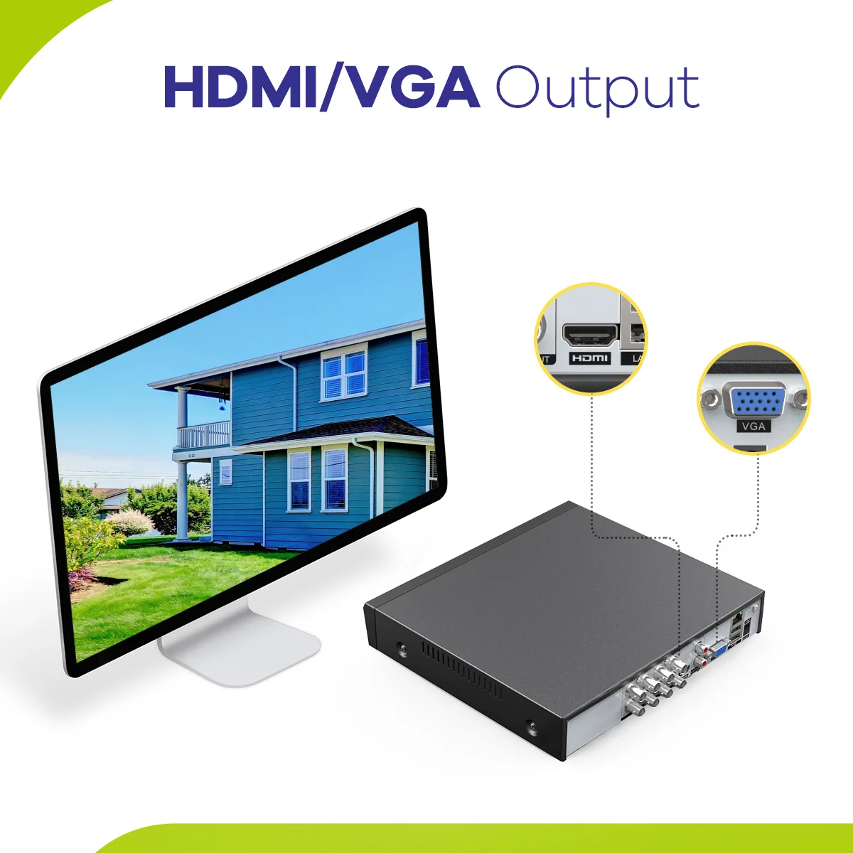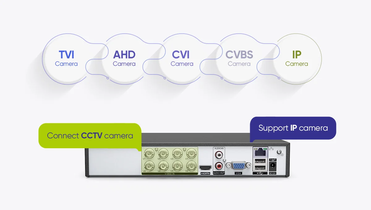 Key features. Support 8CH 1080N definition encoding. Support AHD, TVI,CVI, CVBS, IP video input. HDMI/VGA simultaneous video output. 1 SATA (Up to 8TB). 1*10/100Mbps auto-adaptive Ethernet port, RJ45 port. Automatic networking support, a key to add equipment. Support alarm information push to phone. Support remote access, support ARSP. Mobile phone remote monitoring (iOS, Android). Support Multi browser access,VMS PC client